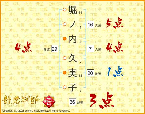 堀(11画)ノ(1画)内(4画) 久(3画)実(14画)子(3画)