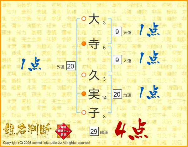大(3画)寺(6画) 久(3画)実(14画)子(3画)