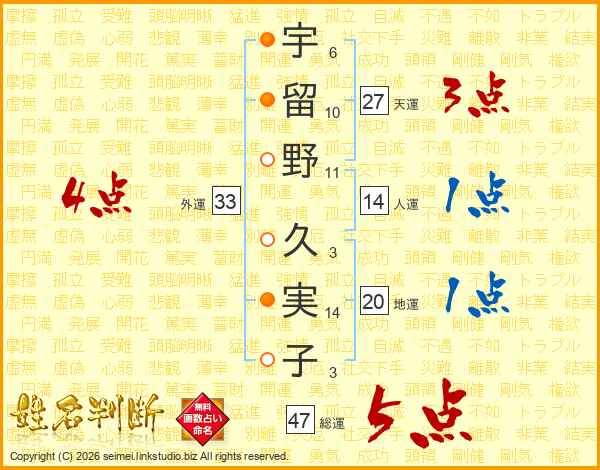 宇(6画)留(10画)野(11画) 久(3画)実(14画)子(3画)