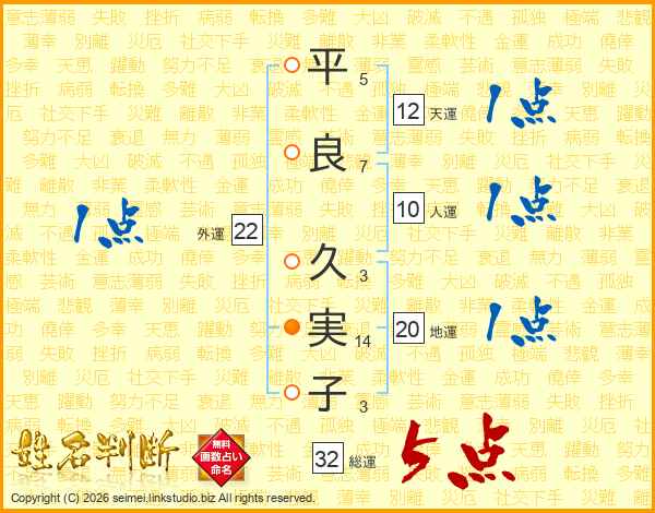 平(5画)良(7画) 久(3画)実(14画)子(3画)
