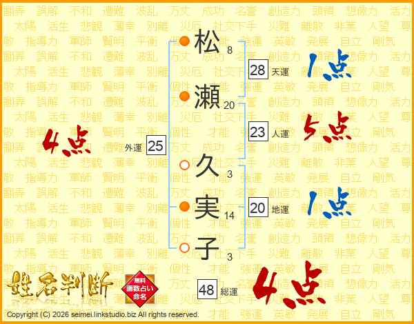 松(8画)瀬(20画) 久(3画)実(14画)子(3画)