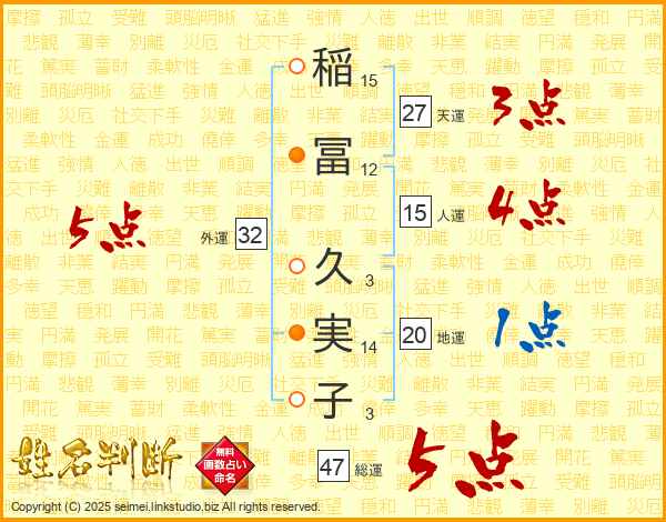 稲(15画)冨(12画) 久(3画)実(14画)子(3画)