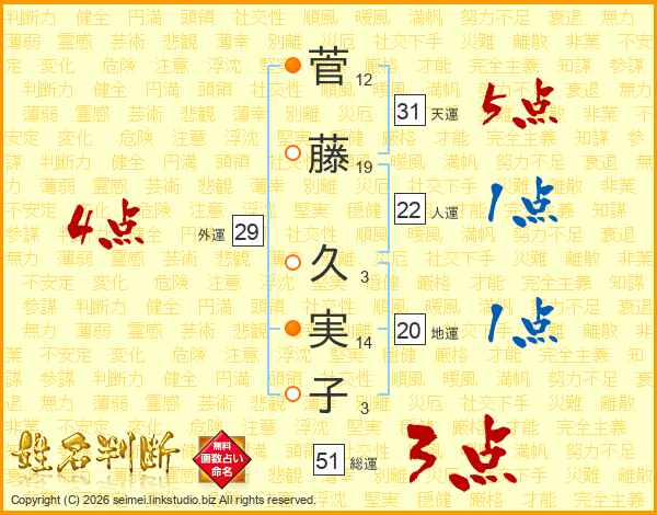 菅(12画)藤(19画) 久(3画)実(14画)子(3画)