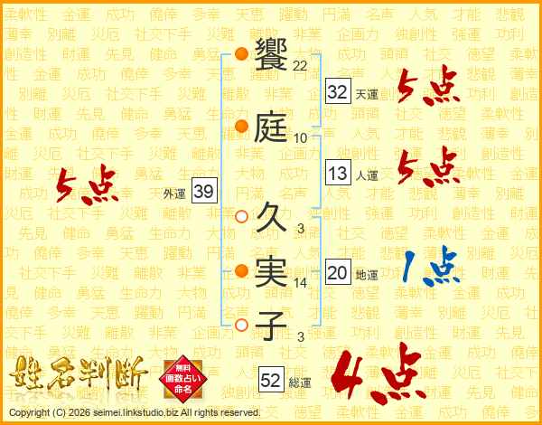 饗(22画)庭(10画) 久(3画)実(14画)子(3画)