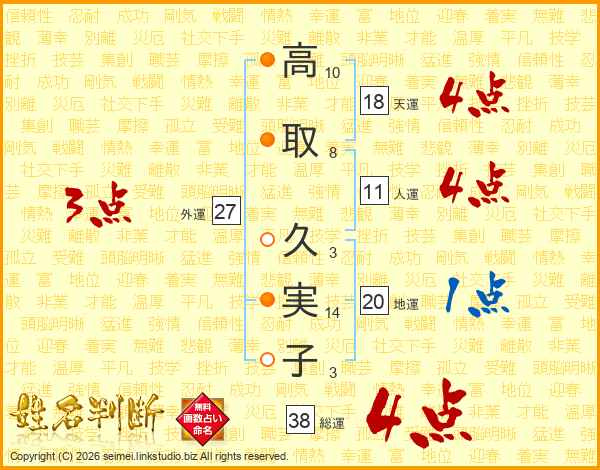 高(10画)取(8画) 久(3画)実(14画)子(3画)