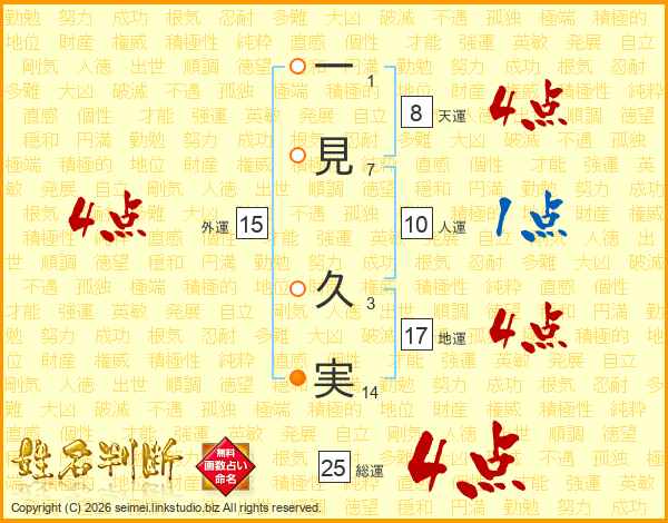 生活面を象徴する運勢です。外部から受ける影響力を表し、結婚運、家庭運や職場、環境への順応性を表します。総運から人運を引いた画数。姓や名が1文字の場合を除く。