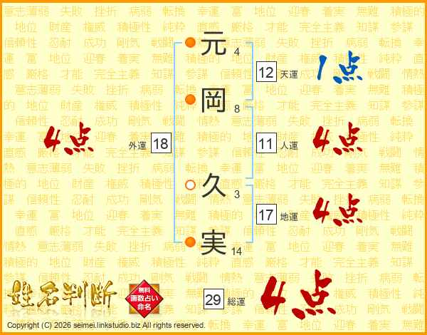元(4画)岡(8画) 久(3画)実(14画)