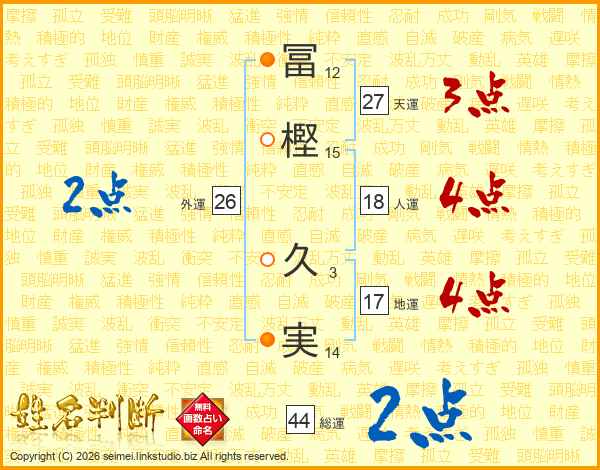 あなたの人生を表す1番重要な運勢です。生涯を通じて影響する総合運となり、主に50歳以降の晩年期に影響を及ぼします。苗字と名前の合計画数。