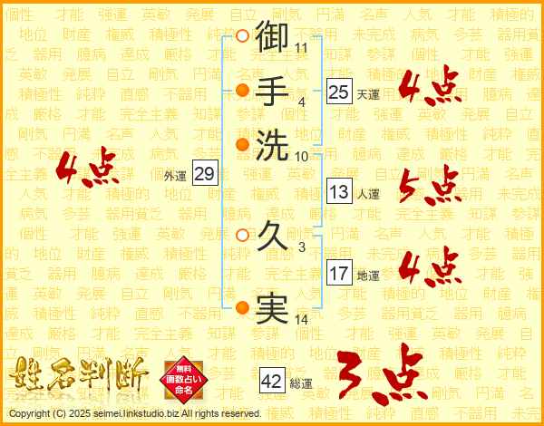 御(11画)手(4画)洗(10画) 久(3画)実(14画)
