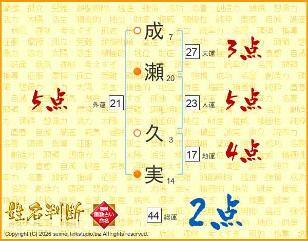 成(7画)瀬(20画) 久(3画)実(14画)