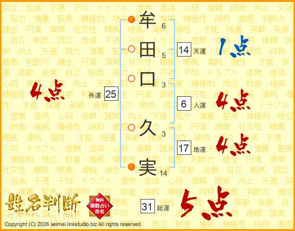 牟(6画)田(5画)口(3画) 久(3画)実(14画)