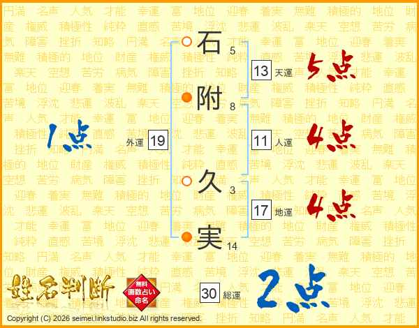 生活面を象徴する運勢です。外部から受ける影響力を表し、結婚運、家庭運や職場、環境への順応性を表します。総運から人運を引いた画数。姓や名が1文字の場合を除く。
