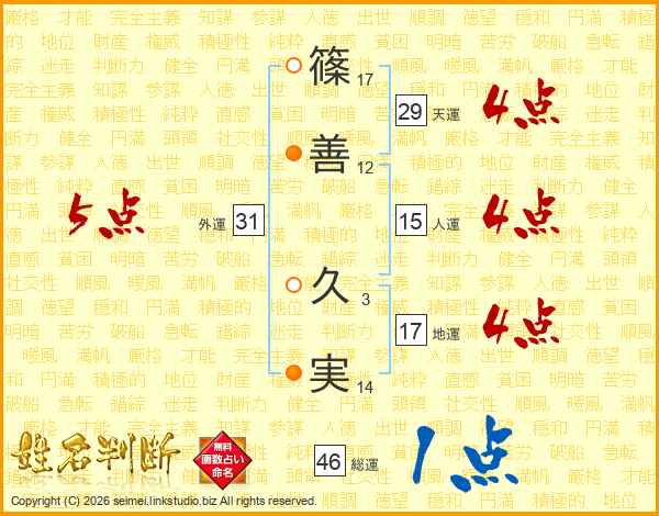 篠(17画)善(12画) 久(3画)実(14画)