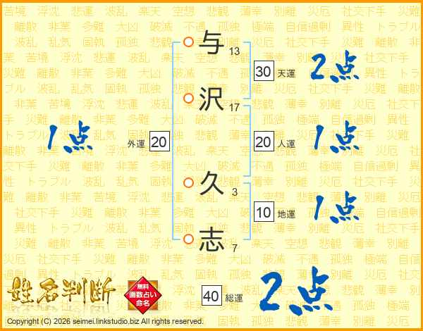 与沢久志さんの人運は20画の1点!
