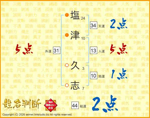 あなたの人生を表す1番重要な運勢です。生涯を通じて影響する総合運となり、主に50歳以降の晩年期に影響を及ぼします。苗字と名前の合計画数。