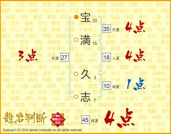 宝(20画)満(15画) 久(3画)志(7画)