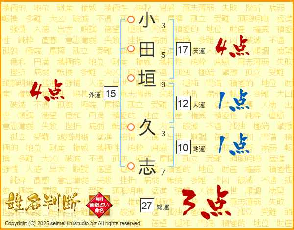 小田垣久志さんの総運は27画の3点!