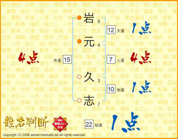 あなたの人生を表す1番重要な運勢です。生涯を通じて影響する総合運となり、主に50歳以降の晩年期に影響を及ぼします。苗字と名前の合計画数。
