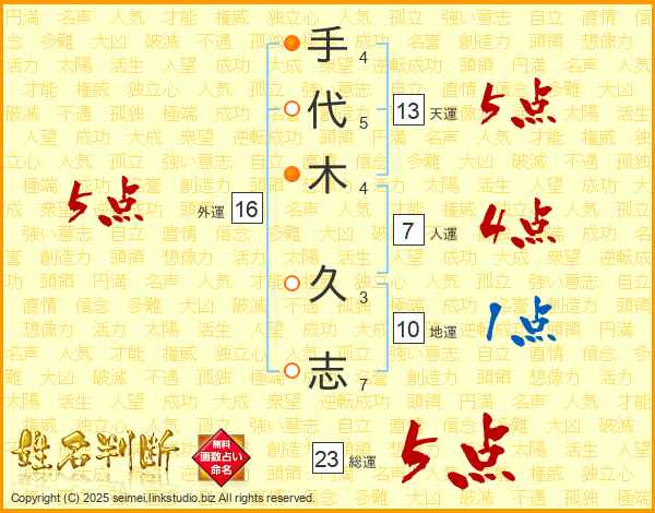 手(4画)代(5画)木(4画) 久(3画)志(7画)