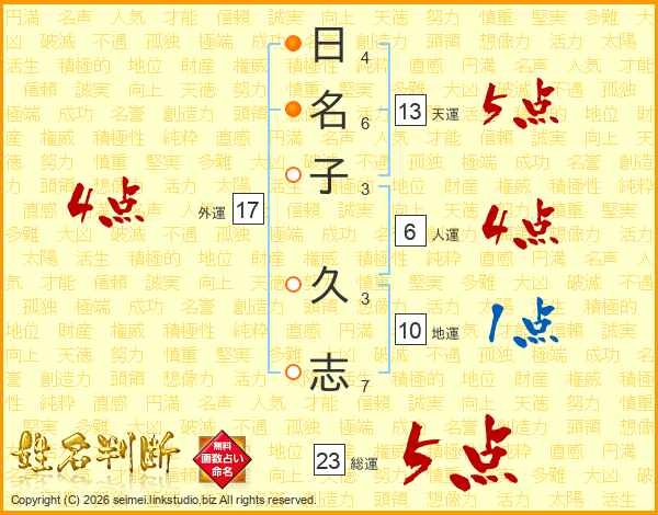 日(4画)名(6画)子(3画) 久(3画)志(7画)