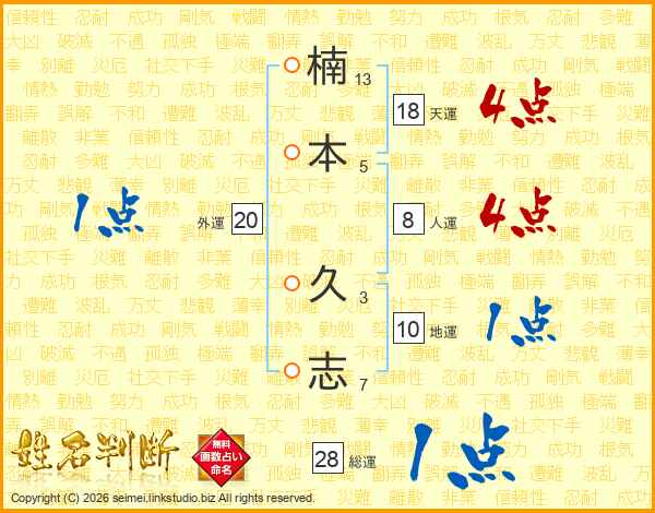 楠(13画)本(5画) 久(3画)志(7画)