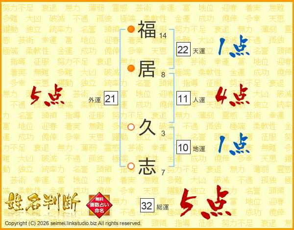 生活面を象徴する運勢です。外部から受ける影響力を表し、結婚運、家庭運や職場、環境への順応性を表します。総運から人運を引いた画数。姓や名が1文字の場合を除く。