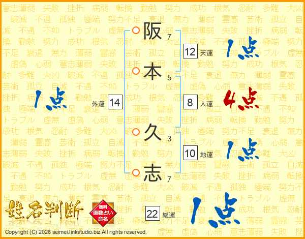 生活面を象徴する運勢です。外部から受ける影響力を表し、結婚運、家庭運や職場、環境への順応性を表します。総運から人運を引いた画数。姓や名が1文字の場合を除く。