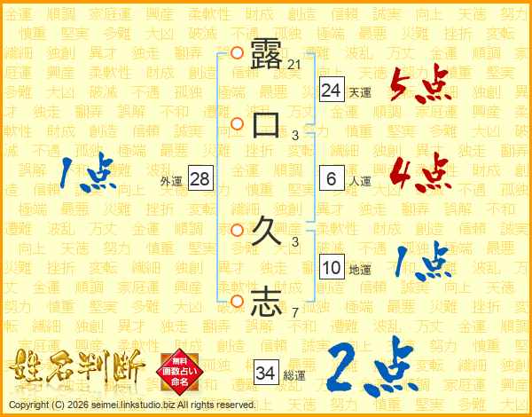 露(21画)口(3画) 久(3画)志(7画)