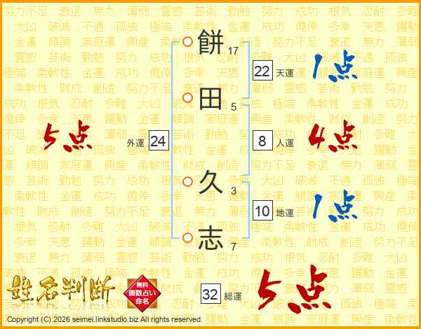 生活面を象徴する運勢です。外部から受ける影響力を表し、結婚運、家庭運や職場、環境への順応性を表します。総運から人運を引いた画数。姓や名が1文字の場合を除く。