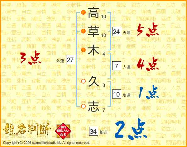 高(10画)草(10画)木(4画) 久(3画)志(7画)