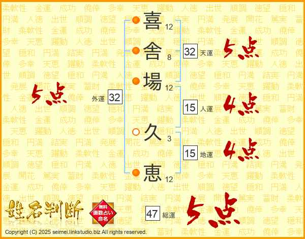 喜(12画)舎(8画)場(12画) 久(3画)恵(12画)