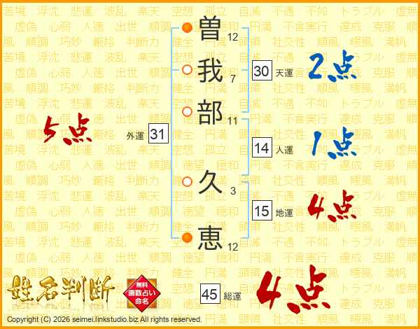 曽(12画)我(7画)部(11画) 久(3画)恵(12画)