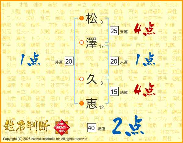 松(8画)澤(17画) 久(3画)恵(12画)