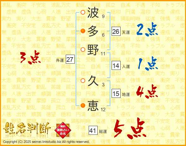 波(9画)多(6画)野(11画) 久(3画)恵(12画)