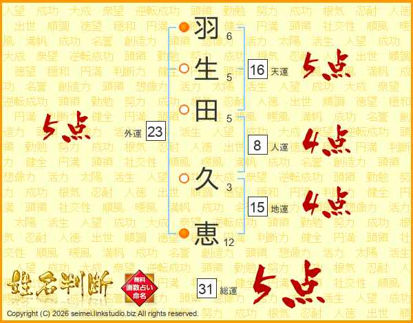 羽(6画)生(5画)田(5画) 久(3画)恵(12画)