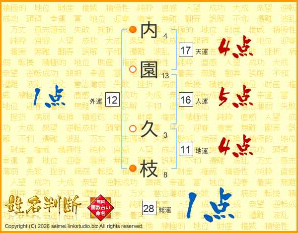 内(4画)園(13画) 久(3画)枝(8画)