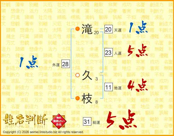 滝(20画) 久(3画)枝(8画)