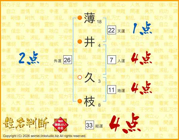 生活面を象徴する運勢です。外部から受ける影響力を表し、結婚運、家庭運や職場、環境への順応性を表します。総運から人運を引いた画数。姓や名が1文字の場合を除く。