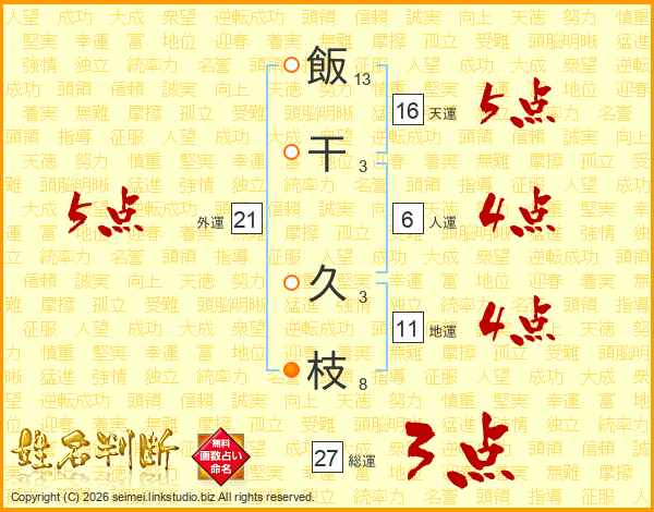 生活面を象徴する運勢です。外部から受ける影響力を表し、結婚運、家庭運や職場、環境への順応性を表します。総運から人運を引いた画数。姓や名が1文字の場合を除く。