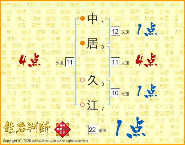 中(4画)居(8画) 久(3画)江(7画)