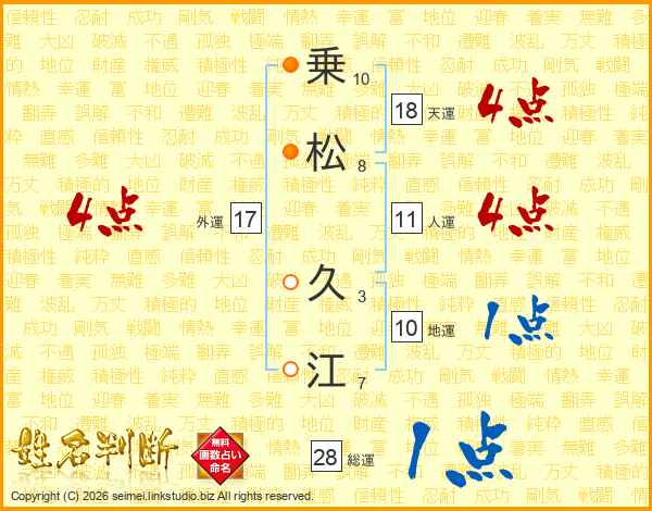 生活面を象徴する運勢です。外部から受ける影響力を表し、結婚運、家庭運や職場、環境への順応性を表します。総運から人運を引いた画数。姓や名が1文字の場合を除く。