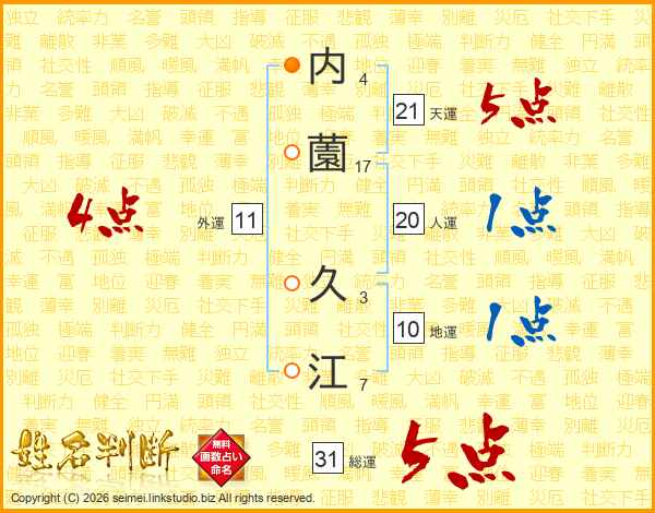 生活面を象徴する運勢です。外部から受ける影響力を表し、結婚運、家庭運や職場、環境への順応性を表します。総運から人運を引いた画数。姓や名が1文字の場合を除く。
