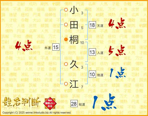 小(3画)田(5画)桐(10画) 久(3画)江(7画)
