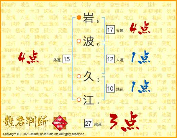 生活面を象徴する運勢です。外部から受ける影響力を表し、結婚運、家庭運や職場、環境への順応性を表します。総運から人運を引いた画数。姓や名が1文字の場合を除く。