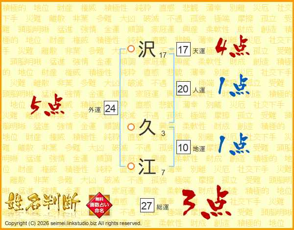 生活面を象徴する運勢です。外部から受ける影響力を表し、結婚運、家庭運や職場、環境への順応性を表します。総運から人運を引いた画数。姓や名が1文字の場合を除く。