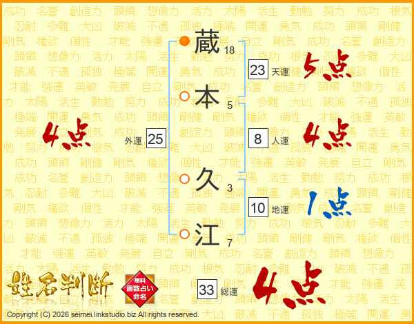 蔵(18画)本(5画) 久(3画)江(7画)