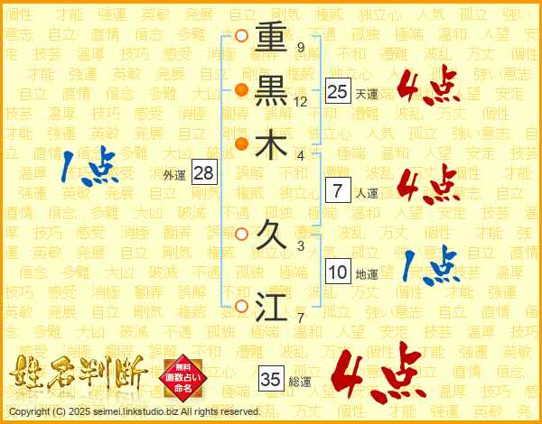 重(9画)黒(12画)木(4画) 久(3画)江(7画)
