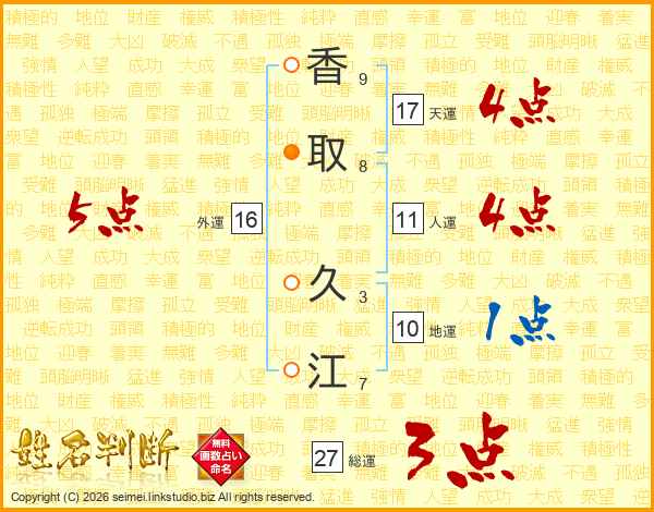 生活面を象徴する運勢です。外部から受ける影響力を表し、結婚運、家庭運や職場、環境への順応性を表します。総運から人運を引いた画数。姓や名が1文字の場合を除く。