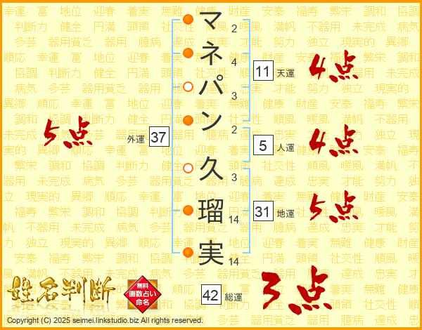 マ(2画)ネ(4画)パ(3画)ン(2画) 久(3画)瑠(14画)実(14画)