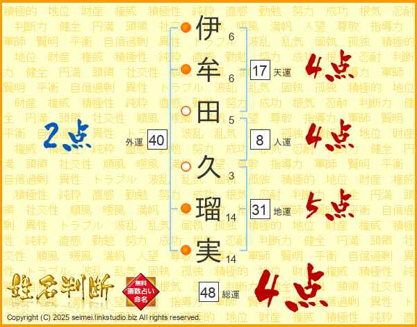 伊(6画)牟(6画)田(5画) 久(3画)瑠(14画)実(14画)